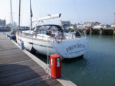 | The visitors berth in the marina. The fuel berth is at right angles at the far end. Port and Bridge control just right of Progress's spray hood, the bridge behind it. |